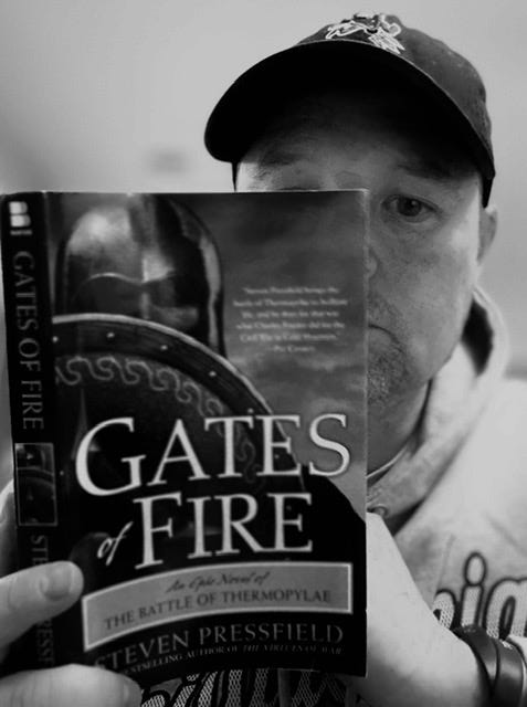 I’m currently reading Gates of Fire by Steven Pressfield, which is as brutal. It’s about the Spartans preparing fror their grear battle at Thermopylae against a Persian invasion. It’s violent, bloody and obscene and makes my physical therapy session in my dusty garage look like a spa day in the French Riviera.